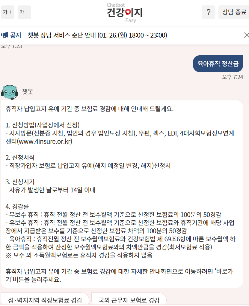 - 국민건강보험공단 챗봇 활용: "육아휴직 정산금 얼마인가요?"라고 물어보면 본인의 가입 상태에 따른 상세 답변을 줍니다.