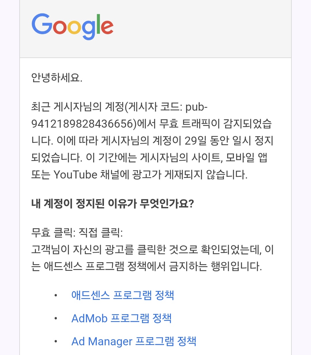 "귀하의 광고 계정이... 부정 활동으로 인해... 29일간 정지됩니다."